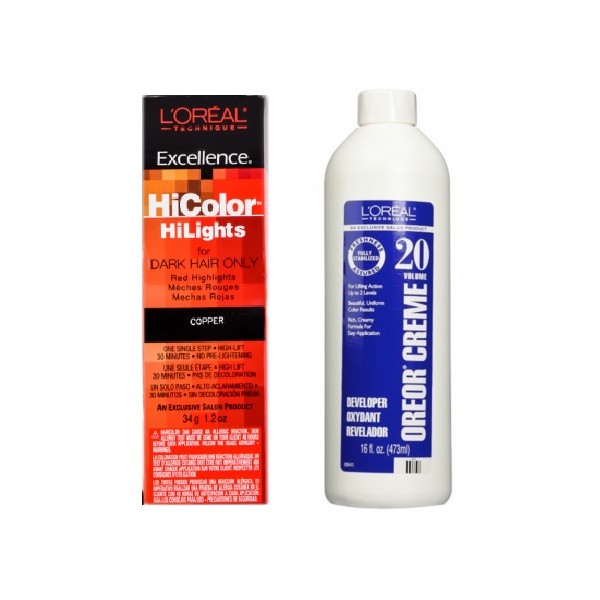 L’Oreal HiColor Copper HiLights For Dark Hair Only. Developed to lift dark hair in one single step, without brassiness. Rich, smooth creme formula conditions and penetrates hair. Breakthrough technology lifts hair 3-4 levels. Intense, long-lasting color.